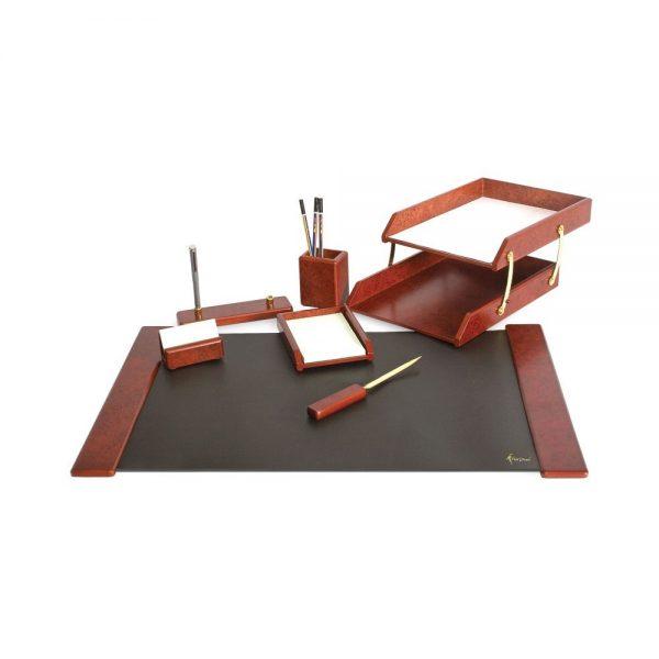 Divdaļīgs dokumentu plauktiņš, papīra bloks ar paliktni, kancelejas nazis, paliktnis 2 pildspalvām, paliktnis zīmuļiem, paliktnis vizītkartēm, paliktnis rakstīšanai, paliktnis aploksnēm.