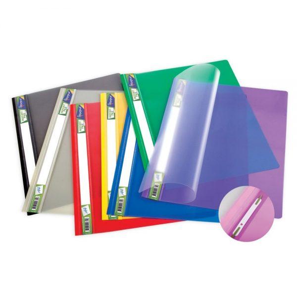 Populārākā biroja mape nelielam dokumentu daudzumam. Caurspīdīgs virsējais vāks, kabatiņa ar etiķeti marķējumam. Spilgtas, piesātinātas krāsas.