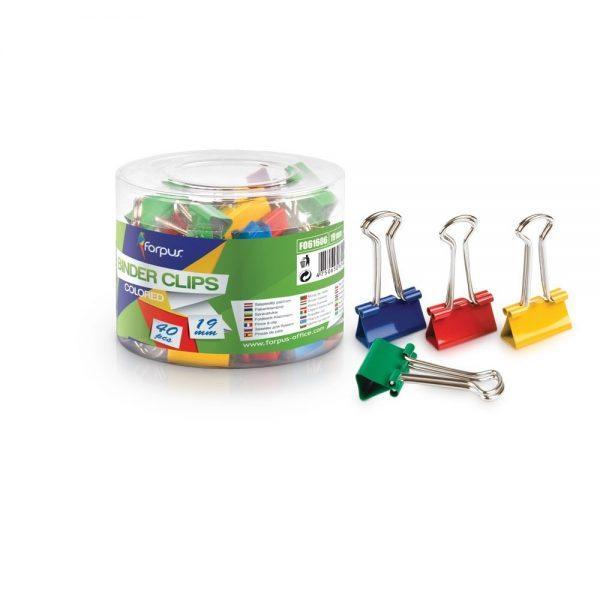 Papīra piespiedējs-knaģīši 19 mm dažādu krāsu(zils, zaļš, dzeltens, sarkans) iepakots plastmasa kastītē 40 gab.